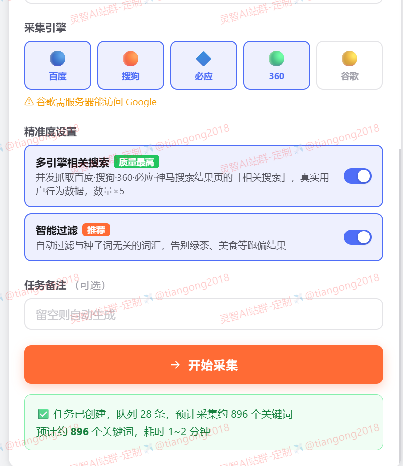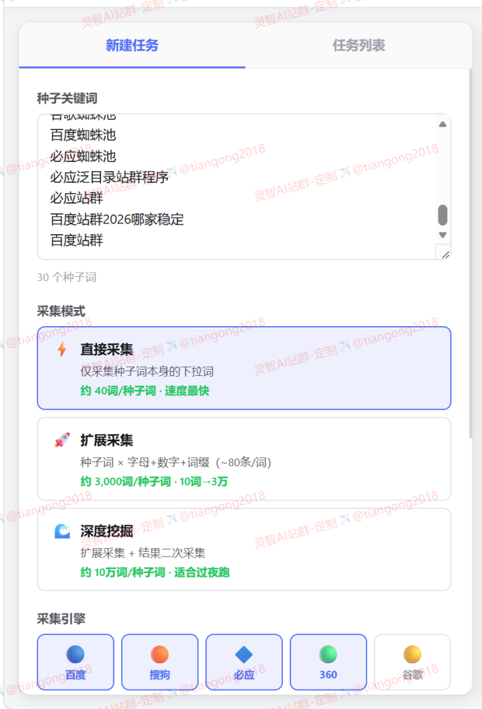 - 扩展采集:自动生成60+长尾变体(怎么、教程、价格、源码等),每个种子词可得约3000词